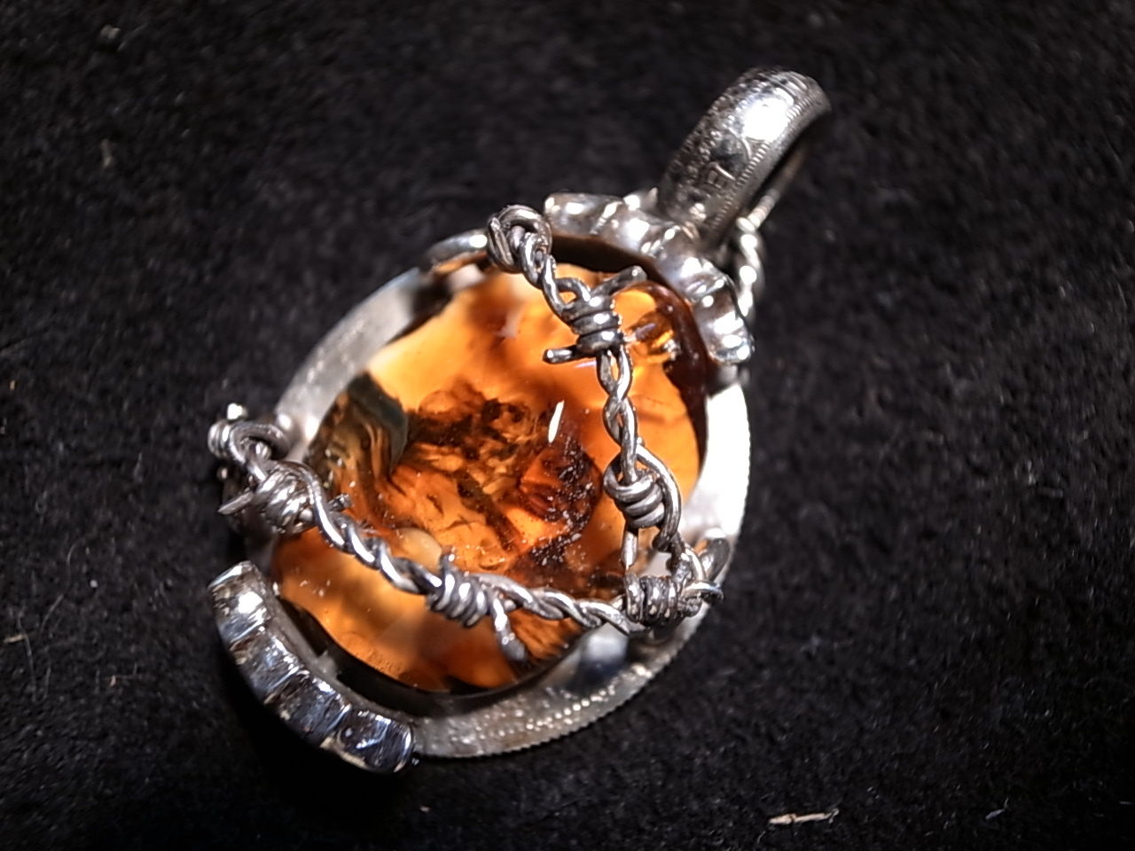 以前お送りした、青石に次いで、琥珀色の石。有刺鉄線で封じている?・・