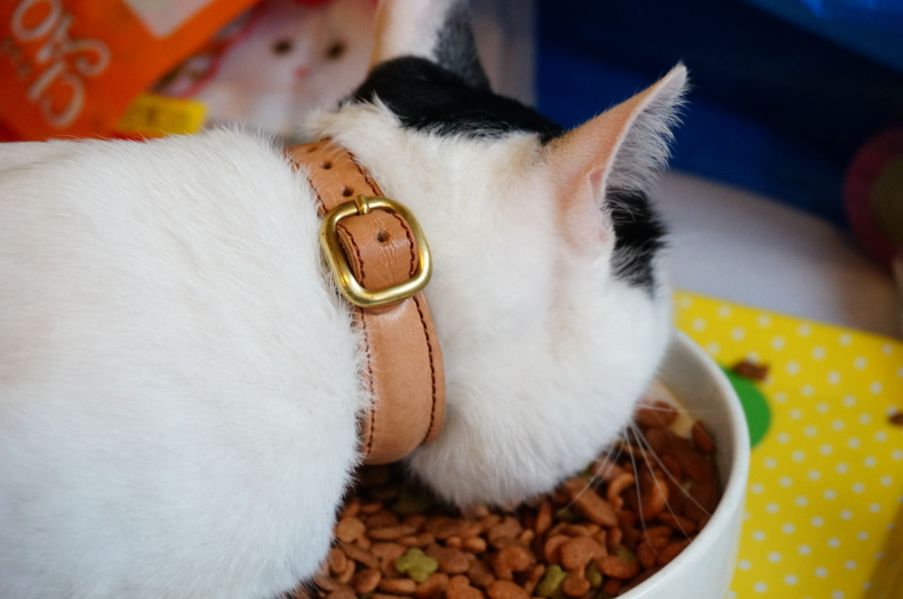 初めて首輪をされてものんきに餌食ってる・・・
