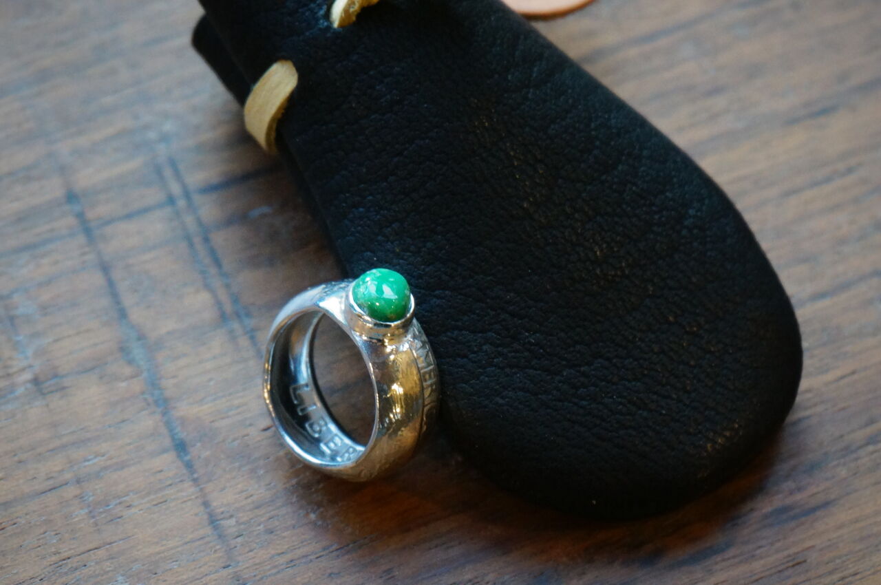 クォーターダラーの銀貨をリングにして、ロイストンの濃いグリーンのターコイズをセットしたリング。